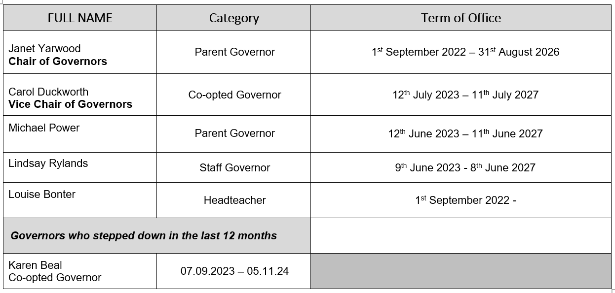 Chair of Governors: Mrs J Yarwood